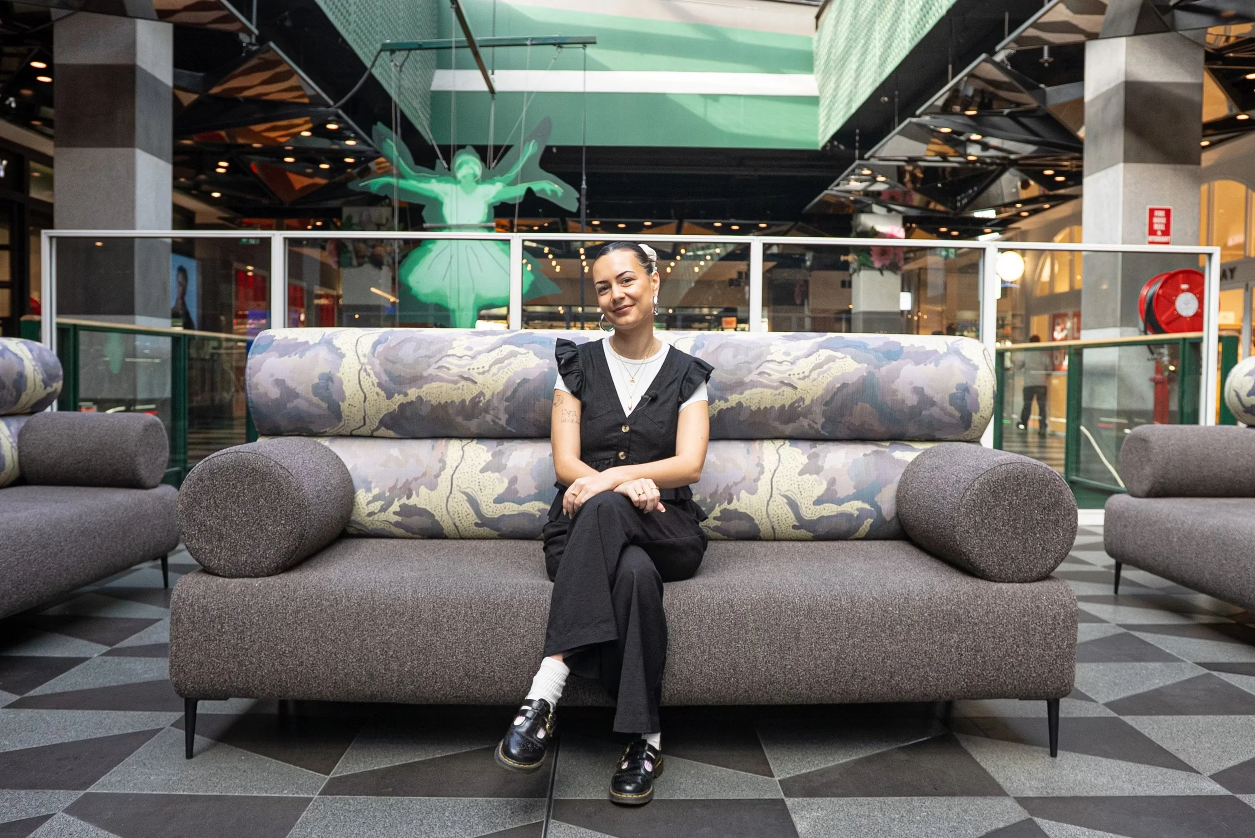 Lucinda Johnson-Cornes, sitting on our Yanada Modular Lounge with the fabric she created during her Indigenous Student Work Placement, located in Melbourne Central. Today Lucinda is one of our House Artists.